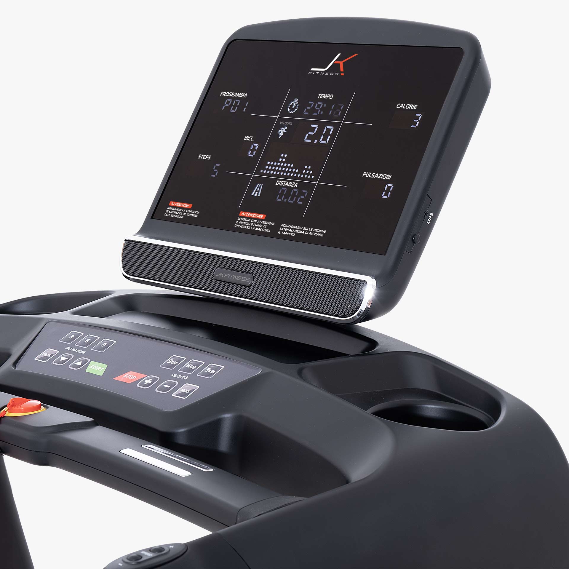 Il quadro di comando del nuovo JK 164 è composto da una grande console con 8 display a LED bianchi e una matrice grafica 8 x 16 pxl, per mantenere sotto controllo tutti i parametri dell’allenamento cardio quali: tempo, distanza, velocità, inclinazione, calorie bruciate, n° passi, frequenza cardiaca, matrice grafica per visualizzazione profilo programma. Il tapis roulant JK 164 è dotato di due ricevitori integrati per collegare i propri devices elettronici (APP, social e musica); e 5.3 kH per la rilevazione della frequenza cardiaca tramite la fascia cardio toracica offerta di serie.