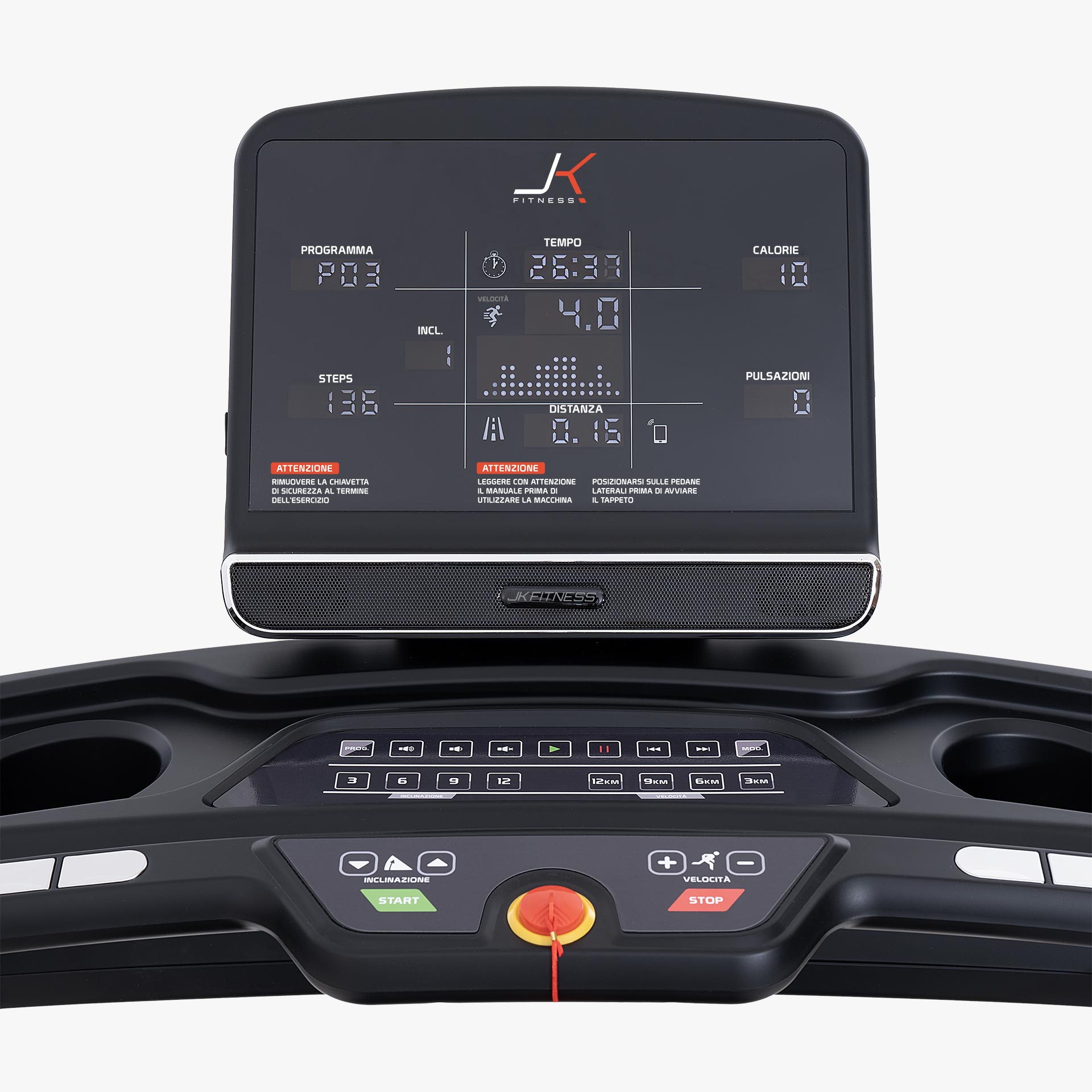 Il tapis roulant JK 174 per essere più vicino alle esigenze e necessità di ogni utilizzatore, è equipaggiato con una serie di programmi per rendere ogni allenamento, il “tuo” allenamento! Sono in dotazione: 1 programma manuale dove tutte le funzioni sono interamente gestite dall’utilizzatore in ogni momento; 4 programmi a target con obiettivi pre-determinati per un tempo, una distanza, un numero di passi e un consumo di calorie; 18 programmi pre-impostati con la variazione combinata fra velocità ed inclinazione; 3 HRC con target al 60% 90% o target determinato dall’utente della frequenza cardiaca personale; 3 User programmi personalizzabili dall’utilizzatore stesso, ovvero bisogna impostare ogni singolo step del programma determinando velocità ed inclinazione; 1 body fat test, utile a comprendere la proprio indice di massa corporea.