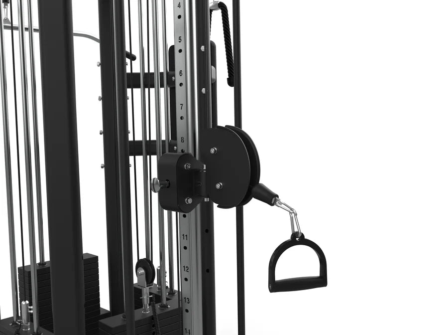DOTAZIONE: maniglia di trazione, barre lat, 2 corda doppia per tricipiti, barra corta, maniglia pulley, maniglia doppia