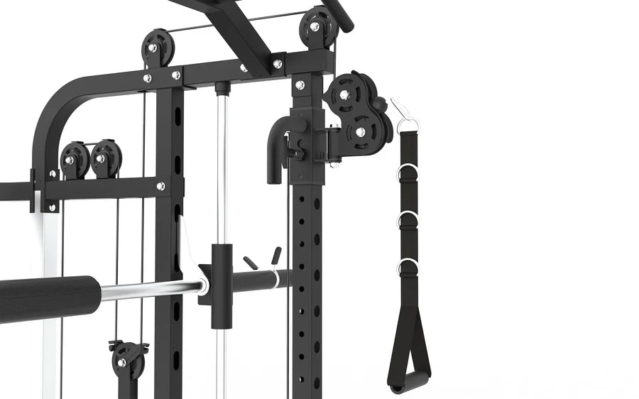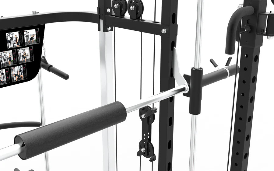 DOTAZIONE 3-IN-1 dual pulley&row, smith machine, rack. Sistema di carico dischi ø50 mm e ø25 mm. 1 Squat bar, 2 J-hooks, coppia fermi di sicurezza bilanciere, barbell storage, barra trazioni multipresa, 4 ganci per fasce elastiche, 8 porta dischi ø50 mm e ø25 mm, 12 ferma dischi a molla ø49 mm e 4 ø25 mm.Attachments: cavigliera, corda doppia tricipiti, catena, landmine, 2 maniglie trazioni, barra lat e barra corta dritta incluse